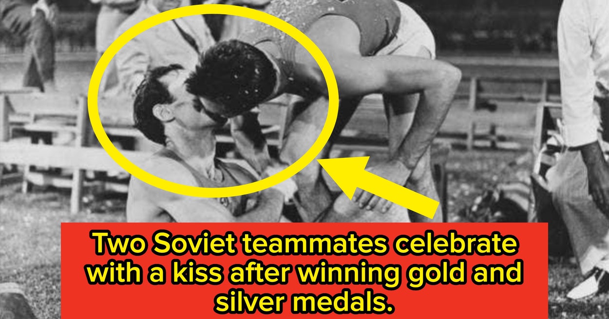 Two Soviet teammates celebrate with a kiss after winning gold and silver medals in the Men’s High Jump event at the 1960s Olympics: