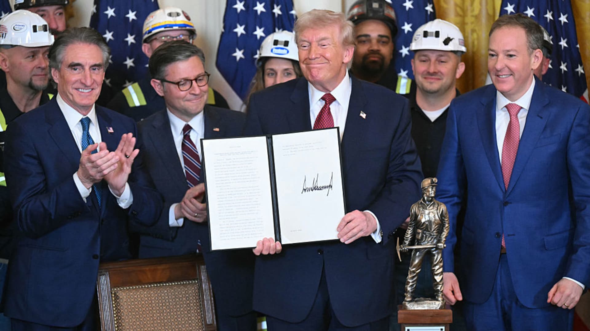 US Secretary of the Interior Doug Burgum, House Speaker Mike Johnson and EPA Administrator Lee Zeldin atans with US President Donald Trump holding a signed executive order directing the military to purchase electricity from coal-fired power plants during a “Champion of Coal” event at the White House in Washington, DC, on February 11, 2026.